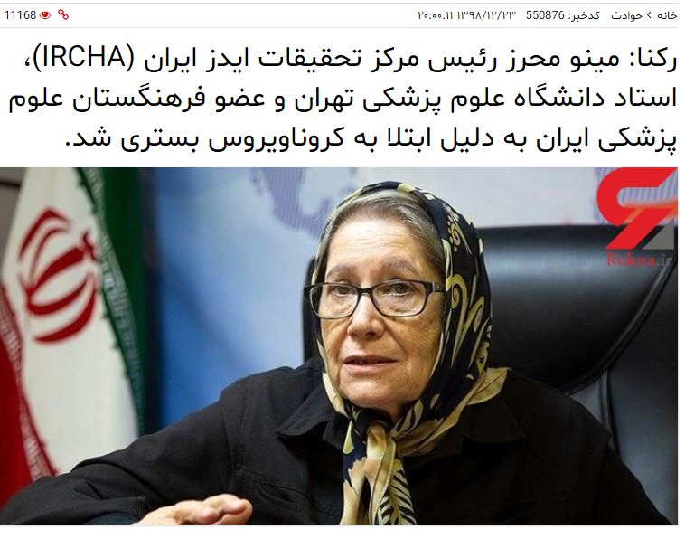 به نوشته سایت رکنا: "#مینو_محرز رئیس مرکز تحقیقات ایدز ایران (IRCHA)، استاد دانشگاه علوم پزشکی تهران و عضو فرهنگستان علوم پزشکی ایران به دلیل ابتلا به کروناویروس بستری شد."