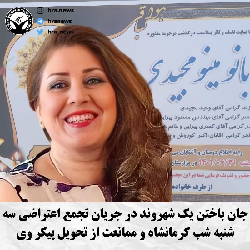 بر اساس گزارش رسیده به ههنگاو، در اعتراضات شامگاه سهشنبه ۲۹ شهریور ۱۴۰۱ در کرمانشاه یک زن اهل قصرشیرین به نام مینو مجیدی در اثر اصابت گلوله مستقیم به سرش جانش را از دست داده است.