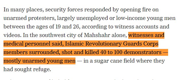 "گزارش نیویورکتایمز از اعتراضها در ماهشهر و کشته شدن معترضان. نیویورکتایمز نوشته نیروهای سپاه پاسداران بین ۴۰ تا ۱۰۰ معترض را کشتهاند. "