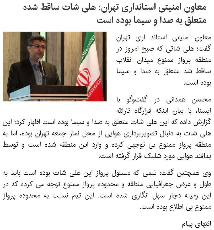 معاون امنیتی استاند اری تهران گفت: هلی شاتی که صبح امروز در منطقه پرواز ممنوع میدان انقلاب و بیت رهبری ساقط شد متعلق به #صداوسیما بوده است