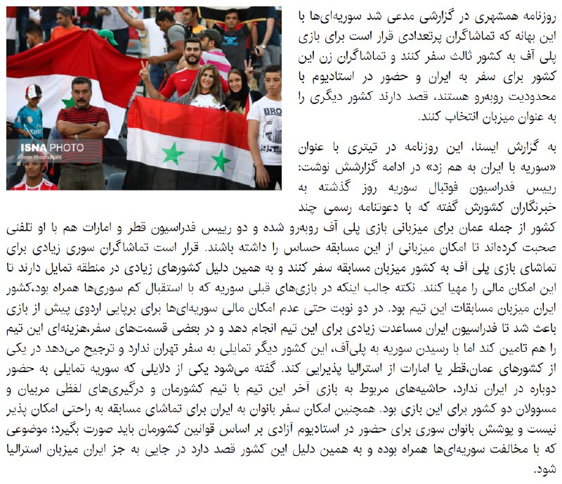 فدراسیون فوتبال سوریه برای دخالت ایران در موضوع حجاب تماشاگرانش به AFC شکایت کرده و خواسته بازی پلیآف به جای ایران در عمان برگزار شود