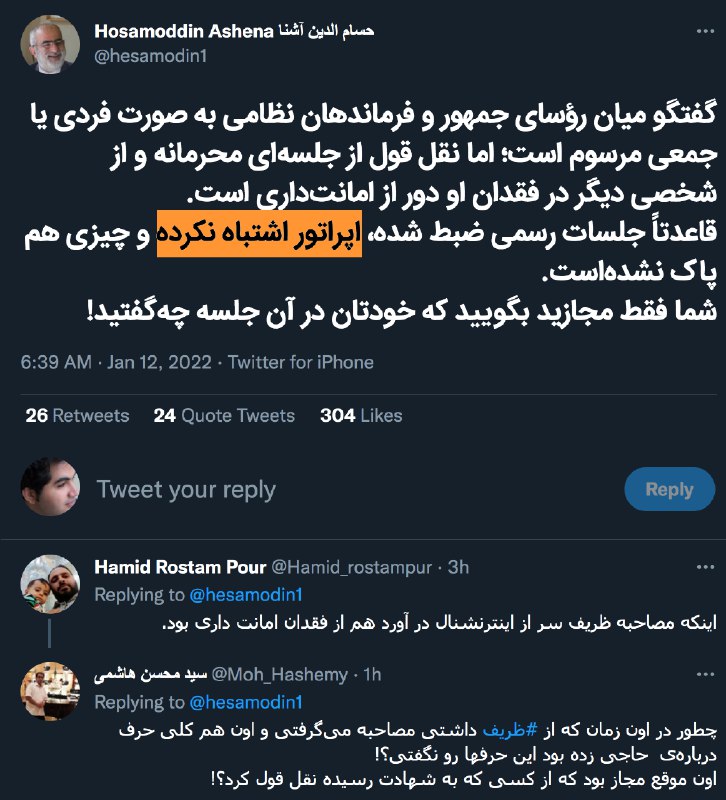 واکنشهایی بودند به این توییت حسامالدین آشنا، مشاور رسانهای-امنیتی حسن روحانی: hesamodin1
