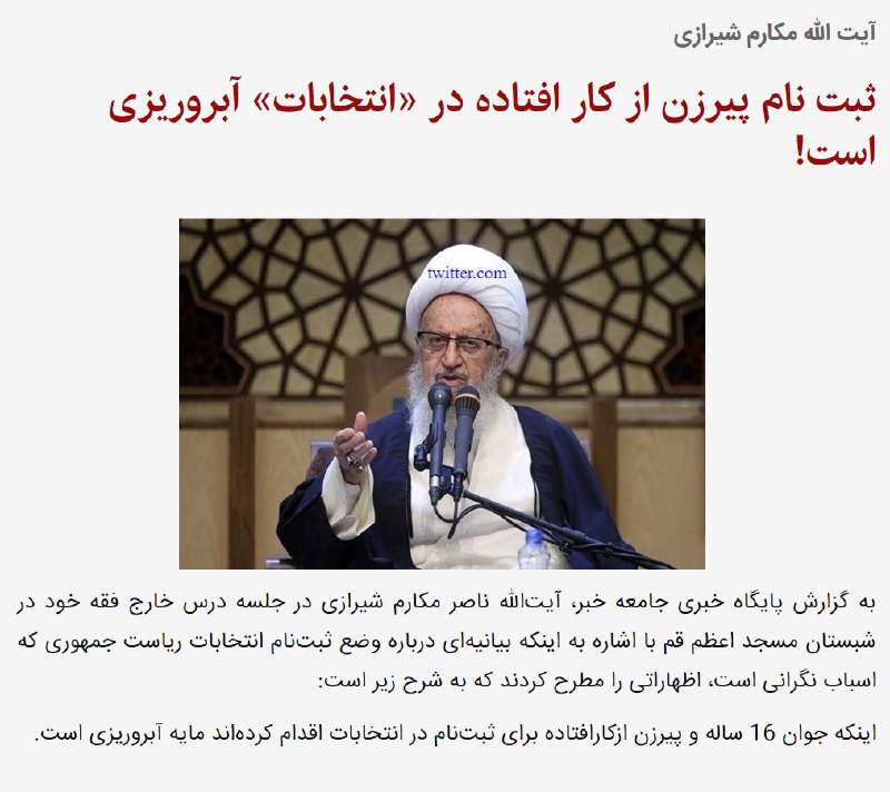 چند روز پیش #مکارم هم چیزی گفته بود با استفاده از عبارت #پیرزن_ازکارافتاده (تصویر پایین) که تا این لحظه فقط ۳ تا توییت دربارهاش بود: