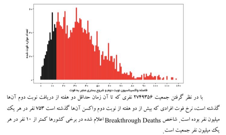 در ایران، نرخ فوت افرادی که بیش از دو هفته از دریافت دز دوم واکسنشان گذشته ۷۵۳ نفر در میلیون است. این عدد در بسیاری از کشورها کمتر ۱۰ است.