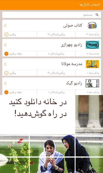 اونجا مجموعهای آزمایشی از بعضی منابع صوتی وب فارسی رو خواهید دید. از کتابهای صوتی و شرح مثنوی مولوی گرفته تا منابع فناوری و خبری. زیر هرکدوم از کانالها گزینهای هست به اسم «پیگیری». هرکدوم رو که مایل بودید «پیگیری» کنید که هربار مجبور نباشید به قسمت «همه کانالها» برید. دفعات بعد میتونید به قسمت «کانالهای آبونه» مراجعه کنید یا در قسمت «پادکستهای من» به جای اسم کانالها، خیلی جزئیتر فهرست کل فایلهایی که قراره بشنوید رو یک جا ببیند.