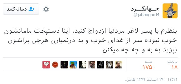 فرض کنیم «دستپخت مامان» رو از سنت مرسوم نتیجه گرفته باشید، اینکه ازدواجکننده با پسرها رو مسؤل پخت و پز براش میدونید چی؟ #زنان"