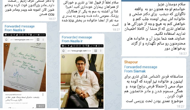 "از خانوادهی دکتر #علیرضاصلحی، پزشک تبریزی پیگیر شدم. متأسفانه همسر و مادربزرگش براثر خوردن غذای نذری آلوده به قرص برنج فوت شدن."