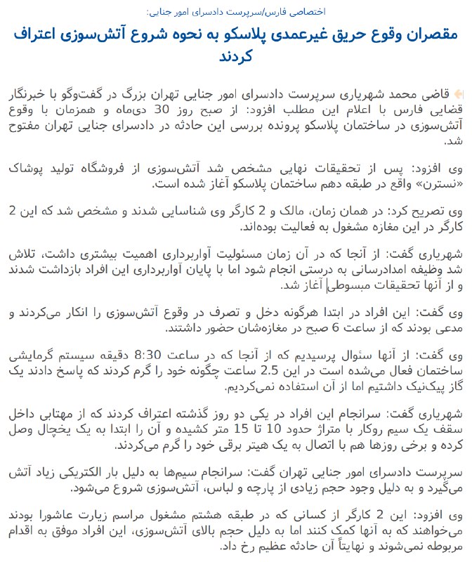 مقصرین #پلاسکو دو نفر کارگر بودند که به استفاده از بخاری برقی و ندادن بودجه و پرداخت نکردن بیمه و سوء مدیریت اعتراف کردند