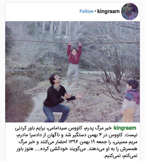 خبر مرگ پدرم، کاووس سیدامامی، برایم باور کردنی نیست. کاووس در ۴ بهمن دستگیر شد و ناگهان از دادسرا مادرم، مریم ممبینی، را جمعه ۱۹ بهمن ۱۳۹۶ احضار میکنند و خبر مرگ همسرش را به او میدهند. میگویند خودکشی کرده.... هنوز باور نمیکنم، نمیکنیم.