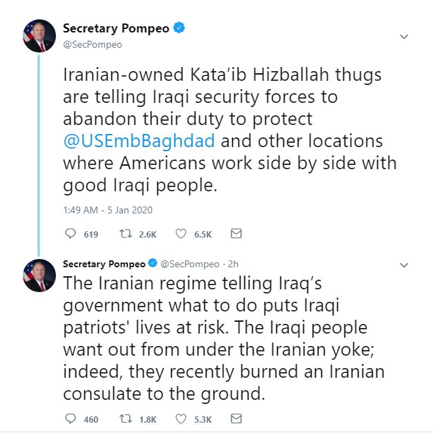 در واکنش به این هشدار مایک #پومپئو وزیر خارجه آمریکا در توییتی نوشت: "اوباش #کتائب #حزب‌الله تحت امر ایران به نیروهای امنیتی عراق می‌گویند که پست خود را برای حفاظت از سفارت آمریکا در بغداد و سایر نقاطی که آمریکایی‌ها در کنار مردم خوب عراق کار می‌کنند رها کنند."