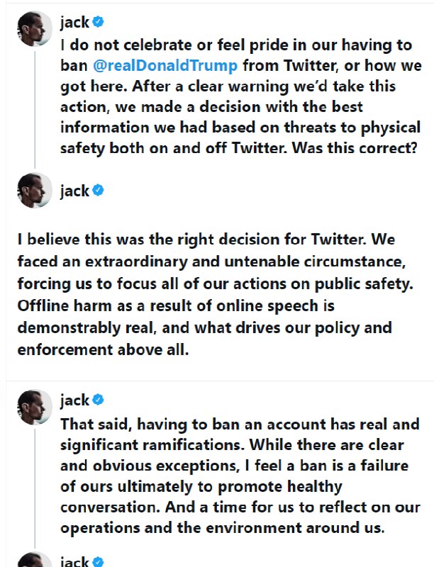دورسی با اشاره به اینکه مسدود کردن ترامپ در شبکههای اجتماعی مختلف هماهنگ شده نبود گفت: اگرچه شرایط مقطع کنونی استثنائا چنین اقداماتی را ایجاب میکرد، اما چنین رویهای در دراز مدت برای آزادی اینترنت «مخرب» است.